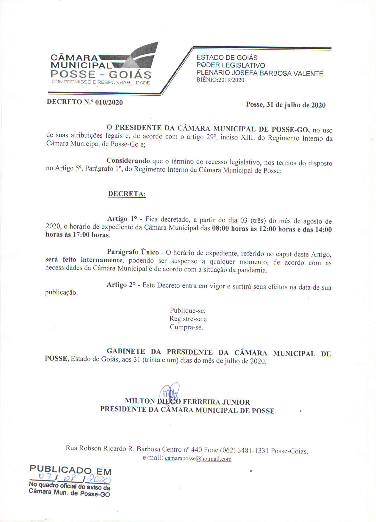FICA DECRETADO, A PARTIR DO DIA 03 (TRÊS) DO MÊS DE AGOSTO DE 2020, O HORÁRIO DE EXPEDIENTE DA CÂMARA MUNICIPAL DE POSSE DAS 08:00 HORAS ÁS 12:00 HORAS, DAS 14:00 HORAS ÁS 17:00 HORAS. (EXPEDIENTE INTERNO).